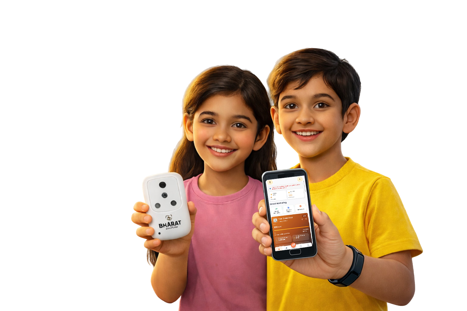 Plug the Bharat Smart Plug into any socket, connect it to the home Wi-Fi via the Bharat Smart Services app, and plug in an appliance. Now kids can see real-time electricity usage and control any pluggable device from their phone — fan, TV, phone charger. It's not a toy. It's a real smart home device.
